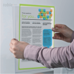 Buzunar autoadeziv  din material transparent de înaltă rezistență (PET). Este ideal pentru prezentarea diferitelor texte sub formatul A4, de exemplu, meniuri, liste de prețuri, pliante, etc. Buzunarul este fixat pe perete cu o bandă autoadezivă pe ambele fețe.