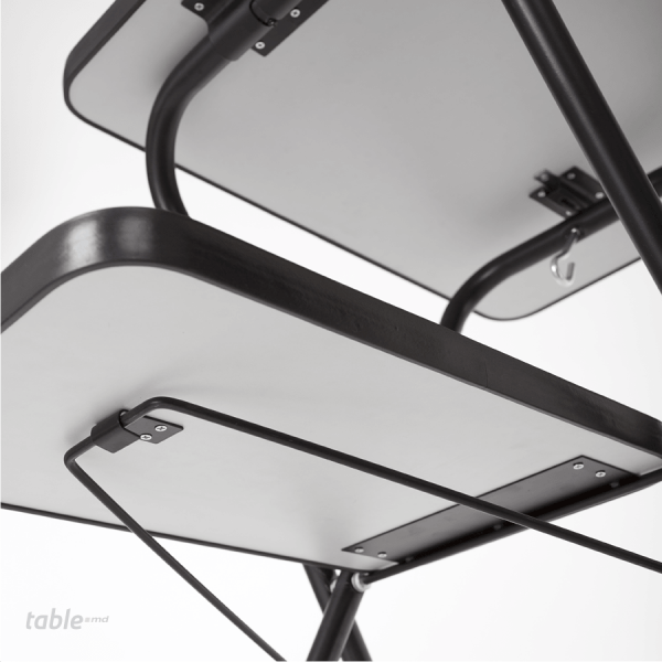 Masă pentru echipament de prezentare GIGANT II, ideală pentru săli de curs, conferințe sau training-uri. Se strânge foarte repede (asemenea unei scări) și ocupă foarte puțin loc atunci când este depozitată într-un spațiu anumit. Structură solidă de oțel de culoare neagră. Dispune de 2 rafturi de culoare gri cenușie, cea superioară cu dimensiune de 60×40 cm, cea inferioară – 46×29 cm, pe care putem așeza echipamentele de proiecție. Bordurile puțin ridicate a rafturilor împiedică alunecarea dispozitivelor de pe acestea. Gradul de înclinarea a raftului superior poate fi mărit ușor cu 15° cu ajutorul unui șurub.