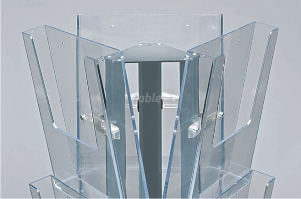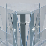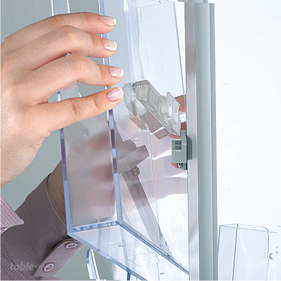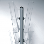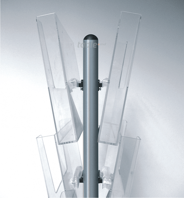 Suport pentru broșuri MULTISIDE cu 2, 3 sau 4 fețe, poziționat pe un piedestal de aluminiu solid (înălțime: 160 cm). Rafturile sunt realizate din material acrilic transparent. Standul a fost proiectat pentru a permite utilizatorului să poziționeze rafturile în orice modalitate, după cum este necesar în funcție de spațiul disponibil. Standul vă permite să fixați  până la 10 rafturi în format A4 sau până la 12 rafturi în format A5 sau 1/3 din formatul A4. Piedestalul este disponibil în culoare argintie, echipat cu roți rotative. Produs este prevăzut pentru auto-asamblare. Setul include: elemente de asamblare. Notă: rafturile sunt vândute separat.
