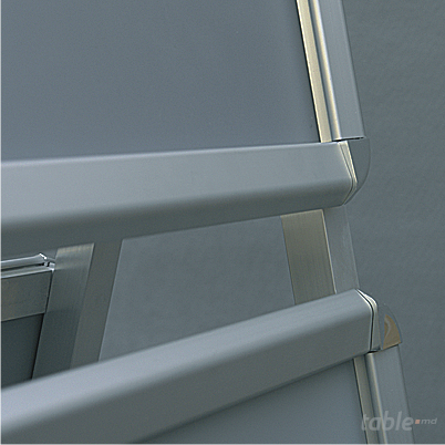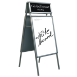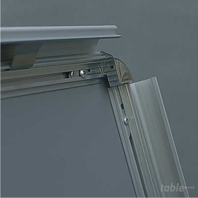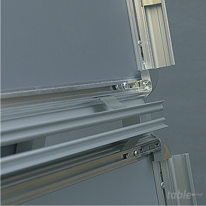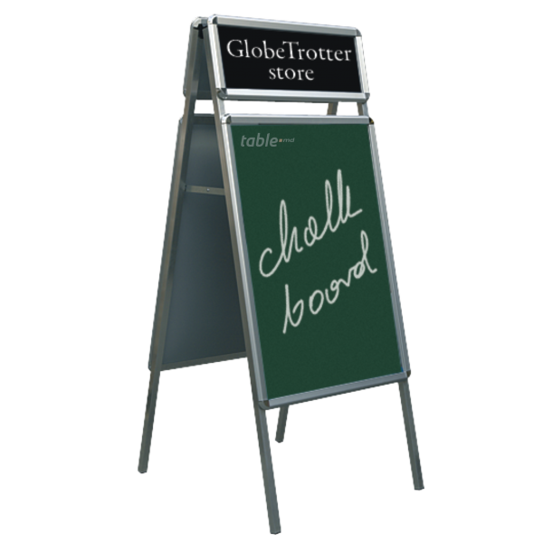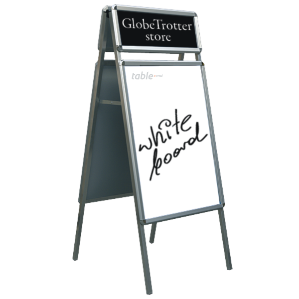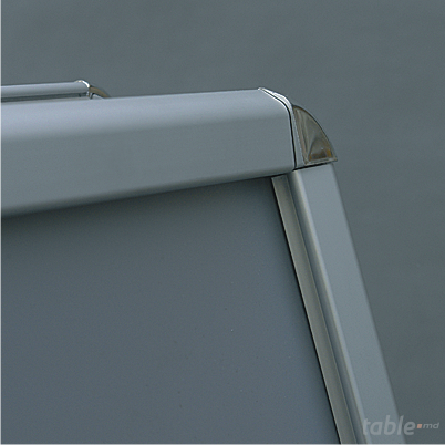 Tablă pentru poster cu 2 fețe, ramă  în argint anodizat cu lățimea de 32 mm, colțurile fiind de plastic rotunjite. Este foarte ușor de deschis și de plasat posterul, fiind dotat cu sistemul SNAP de închidere și protejat de pelicula anti-reflex, care impiedică reflectarea luminii și deasemenea decolorarea posterului. Puteți alege între suprafața pentru banner cu sistemul SNAP și cea verde pentru scriere cu cretă sau suprafața pentru banner cu sistemul SNAP și cea albă pentru scriere cu marker. Suportul e  elegant, cu profil de aluminiu, stabil și rezistent la condițiile meteorologice, fiind prevăzut cu o placă suplimentară în spate care îi conferă duritatea necesară. În plus, produsul este prevăzut cu un panou suplimentar în partea superioară pentru logo-ul dumneavoastră sau alte informații suplimentare. Garanție: 2 ani.
