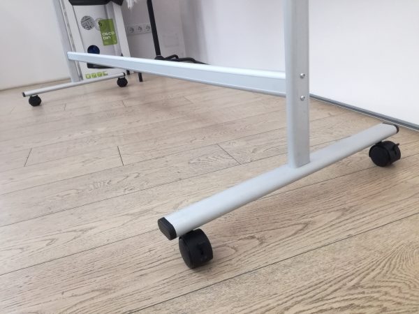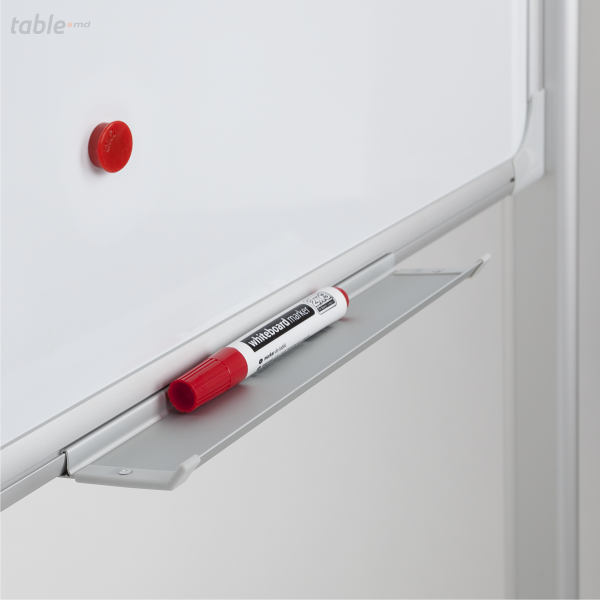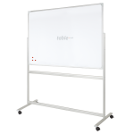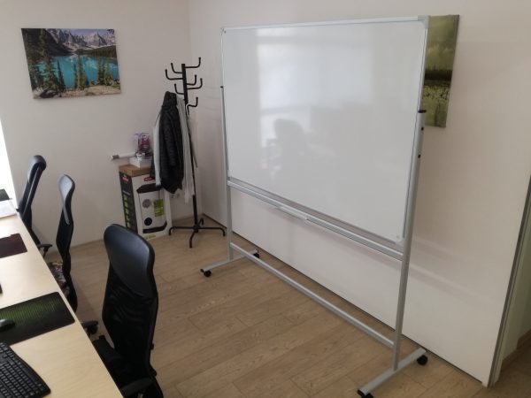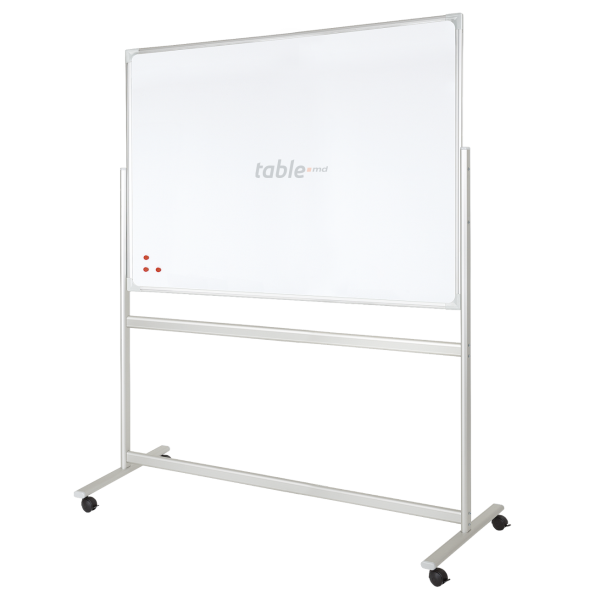 Tabla mobila alba rotativa magnetica are rama din aluminiu de culoare gri cu grosimea de 0,25 mm și lățimea de 20 mm. Tabla este mobilă, având posibilitatea de a scrie pe ambele părți. Fixarea tablei se face pe laterale, cu posibilitatea de blocare sub orice unghi de înclinare. Suport mobil din aluminiu, prevăzut cu rotile blocabile. Tabla este prevăzută cu suport pentru marker. De asemenea setul conține 2 cleme de prindere pentru blocurile de hârtie și setul de montare.