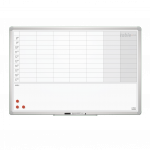 Ideală pentru organizarea timpului (este disponibil tablă pentru planificarea anului, planificarea lunii, săptămânii, zilei după ore etc) pe orizontală sau verticală. Pot fi însemnate diverse informații precum zile sau ore pentru programarea activităților/ întâlnirilor/acțiunilor etc. Suprafață de lucru metalo-ceramică magnetică, de culoare albă, cu liniatură gri. Ramă din aluminiu, cu colțar ABS din plastic. Fixarea de perete se face cu 4 șuruburi (incluse în set). Setul conține și un suport de 30 cm (pentru marker), 1 cariocă și 3 magneți. Tabla este incasabilă la șocuri punctuale. Garanție: 2 ani pentru produs, 10 ani pentru suprafața ceramică.